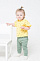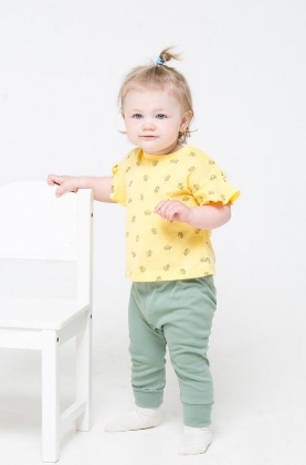Футболка из набивного хлопкового трикотажа. Короткие рукава-воланы со спущенным плечом. Эластичная горловина. Застежка на кнопки-ободок в области плеча для удобства переодевания.