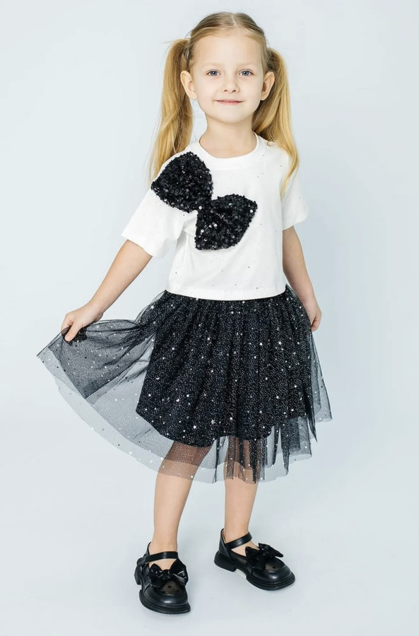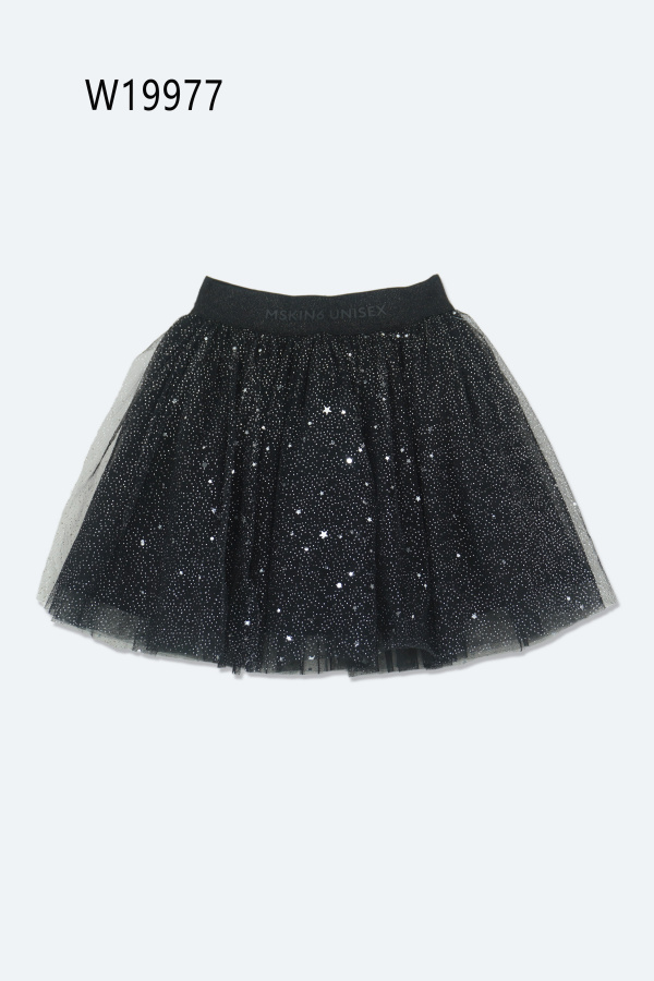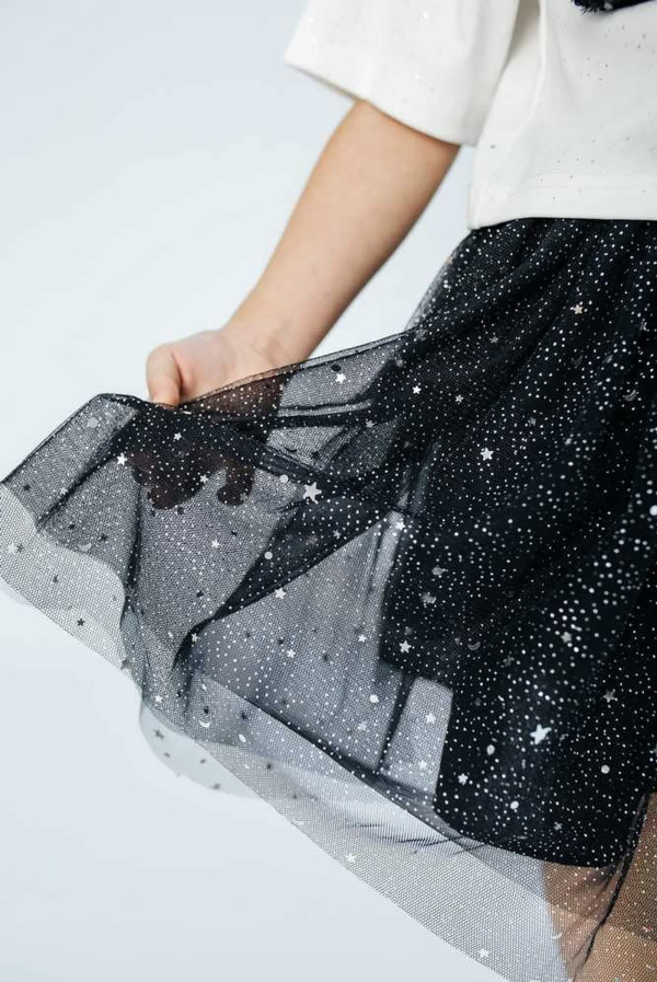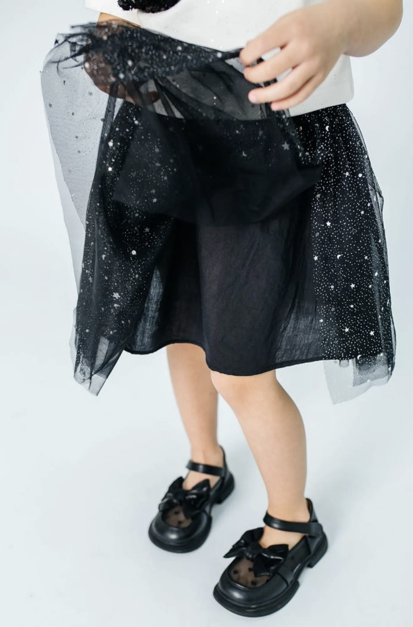Юбка на открытой резинке, двойная сетка с серебристыми звездочками на хлопковом подкладе.