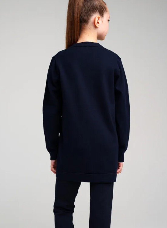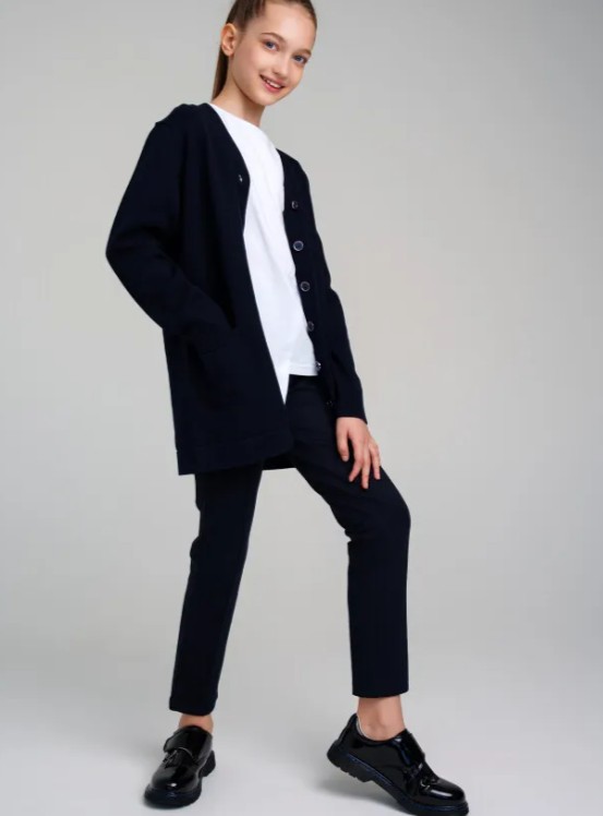 Кардиган удлиненный из вязаного трикотажа. Прямой силуэт. Застежка на пуговицы. Карманы.