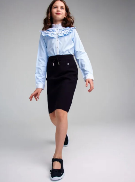 Юбка прямого силуэта из вязаного трикотажа. Пояс на резинке со шнурком. Длина выше колена.