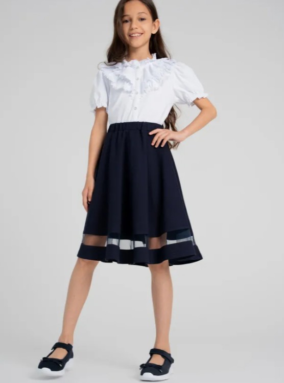Блузка трикотажная полуприлегающего силуэта. Декорирована воланами с кружевом. Эластичная резинка по низу рукавов. Застежка на кнопки. Высокое содержание хлопка 95%. Благодаря наличию эластана в составе ткани, изделие проще в уходе и держит форму.