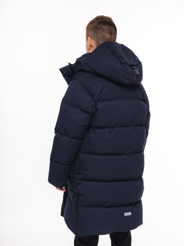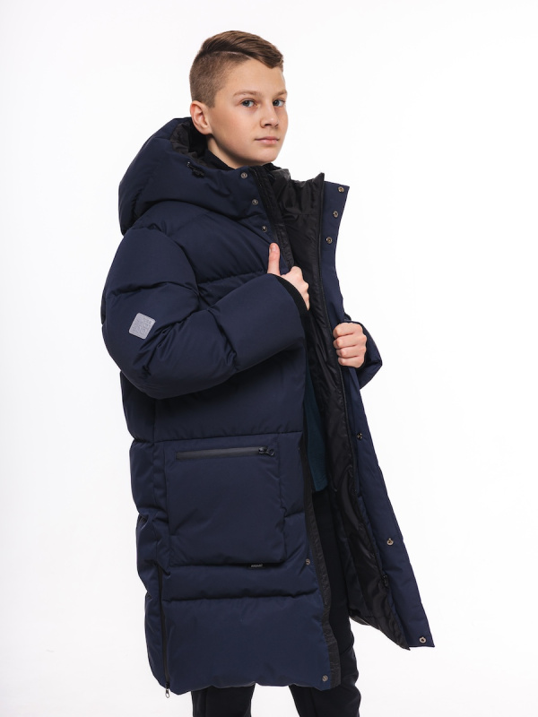 Длинное, объемное полупальто для мальчиков на утеплителе искусственный пух. Современная ткань с тонкой мембраной. Горизонтальные функциональные стежки. Удобные боковые карманы с двойным входом, сбоку и сверху. На левой полочке в верхней части карман с вертикальным входом. Внутренний карман накладной карман на ленте «велькро». Застежка полупальто – молния, закрытая объемной ветрозащитной планкой. Планка фиксируется потайными кнопками. В нижней части боковых швов - молнии. Это не только модно, но и удобно при удлиненном полупальто. Все молнии реверсивные влагозащищенные. Внутренние трикотажные манжеты. Капюшон несъемный. Регулировка лицевой части капюшона выполнена с помощью кулисы со шнуром-резинкой и фиксаторами. Объем капюшона регулируется с помощью пряжки и стропы. Вся фурнитура лаконичного черного цвета. Параллельно молнии на левом кармане термопринт. На рукаве и нижней части спинки светоотражающие нашивки.