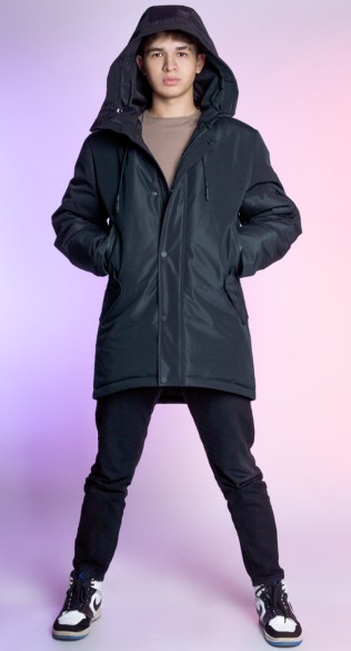 Объёмный втачной капюшон с планкой хорошо защитит от непогоды, можно регулировать при помощи декоративного шнура. На полочках обработаны прорезные карманы с клапанами на